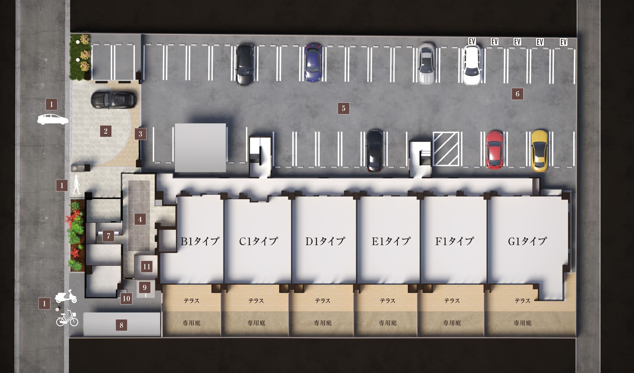 歩行者と車の動線を分け、安全性に配慮したアプローチ設計。