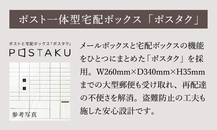 不在時に届いた荷物を受け取れる機能性とデザインに優れた宅配ボックスを採用。
