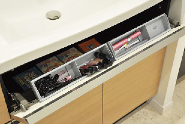 ボウル前の取り出しやすい場所にポケットタイプの収納を設けました。ヘアブラシやヘアピン、コットン、綿棒、マニキュアなどの化粧小物をスッキリ収納できます。