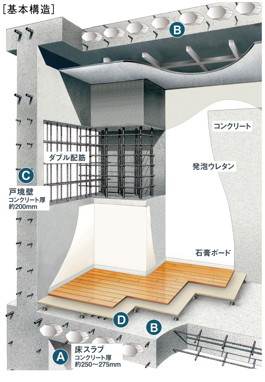 戸境壁は約200mm以上を確保し、強度と遮音性向上を図りました。また、縦横二重のダブル配筋により、構造躯体の剛性を高めています。