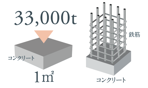 コンクリートの強度は一般基準の強度(18N/m㎡)を大きく上回る約30〜33N/m㎡コンクリートを採用。強い力が加わる地震時にも壊れにくい強度を確保しています。