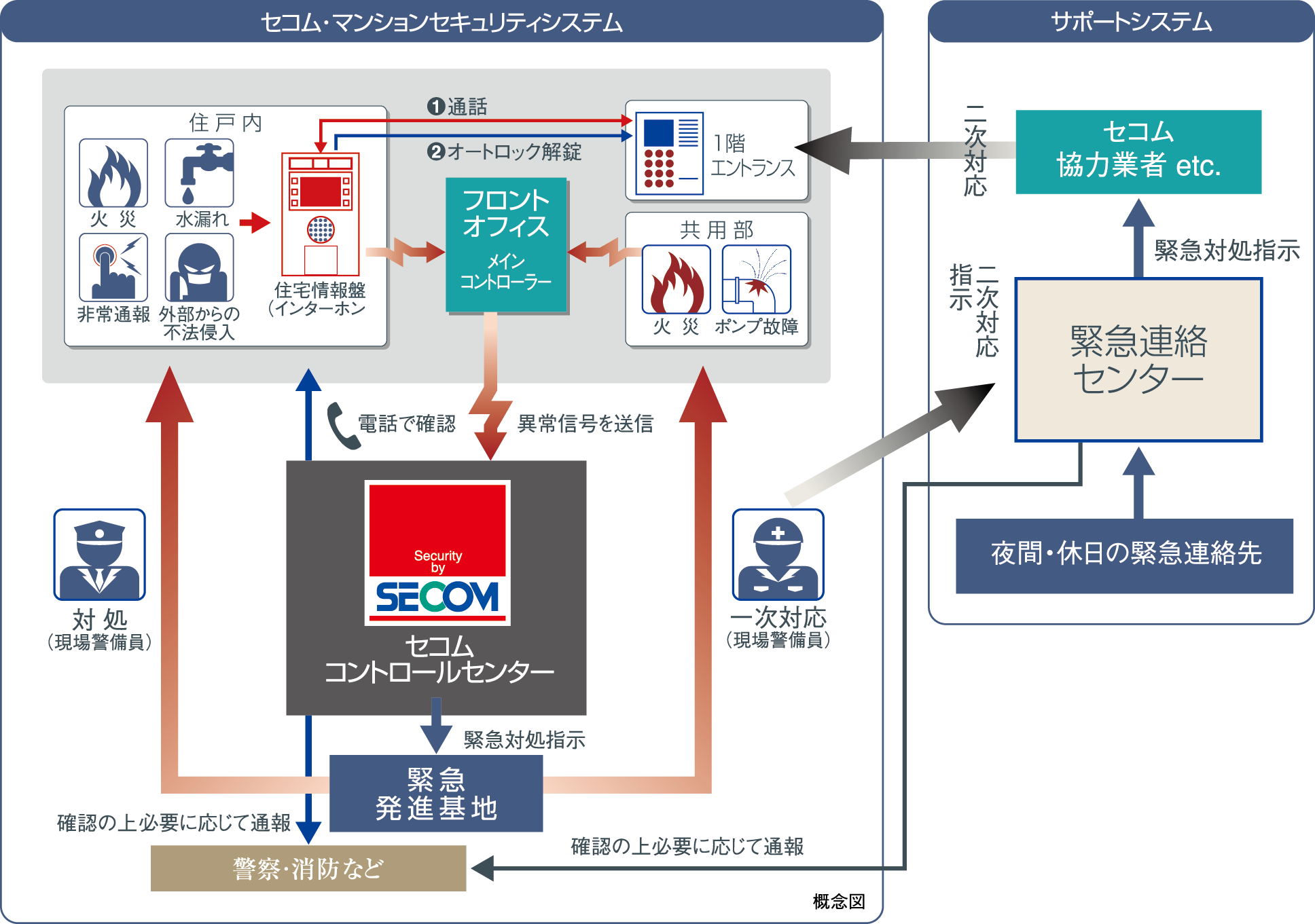 防犯マグネットセンサーや自動火災報知器など、各種センサーが異常を感知すると「セコムコントロールセンター」へ自動通報し、プロのガードマンが駆けつけます。さらに共用部分についてもコントロールセンターで常に安全をチェック。留守中の住戸でも、安全のプロが365日24時間いつでも適切・迅速に対処します。