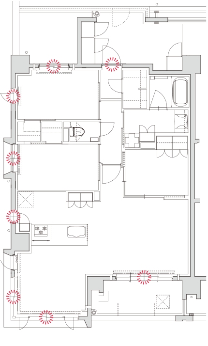 リビング・ダイニングや居室の窓等、および玄関ドアに防犯センサーを設置。(固定窓は除く)不正侵入を感知すると、警報音を発すると同時にセコムコントロールセンターに自動通報します。